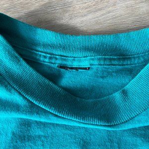 Turquoise t-shirt (the detail shot that shows a bit more green is more accurate to the colour in person).