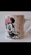 The design includes Minnie Mouse with a pink glitter bow and skirt against a polka dot background with pink and silver glitter dots.