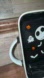 Black ceramic baking dish with Halloween designs. Features skulls, pumpkins, and bats in white and orange.
