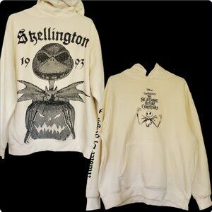 Stay cozy and stylish with this Disney Nightmare Before Christmas Skellington Pullover Hoodie in size 2XL. Featuring a graphic print of Jack Skellington, this super soft fleece hoodie is perfect for all seasons. The cream colour and crew neck design make it a versatile addition to any wardrobe, while the hooded style adds a touch of casual cool. Graphic prints on both the front, back and the arm "Master of Fright". Whether you're a fan of Halloween or just love the spooky theme, this hoodie is a must-have for any Disney lover. Perfect for casual outings or as a unique Christmas gift, this hoodie is sure to become a favourite in your collection.