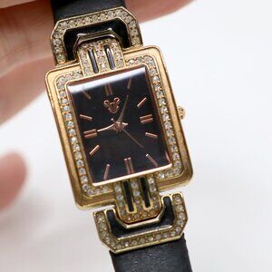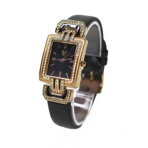 Disney Parks Mickey Mouse Analog Watch Art Deco Gold Black Leather Rhinestones