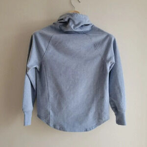 Light blue, cowl neck hoodies. Mickey and Minnie on front with textured clothing.