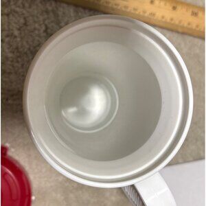 This reusable travel mug showcases vibrant Disney Parks designs, featuring Mickey and friends. Designed with a secure red lid and sturdy white handle for convenience.