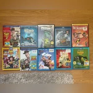 Collection of Disney Pixar blu ray DVDs including Toy Story, Finding Nemo (still sealed), Bugs Life (still sealed), the Incredibles (still sealed), and more.
