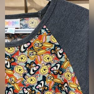 From the Disney collection this unisex top is adorable! The faces of many of your favorite characters with gray sleeves. Subtle colours rather than super bright. See last two pictures for sizing information and a style description.