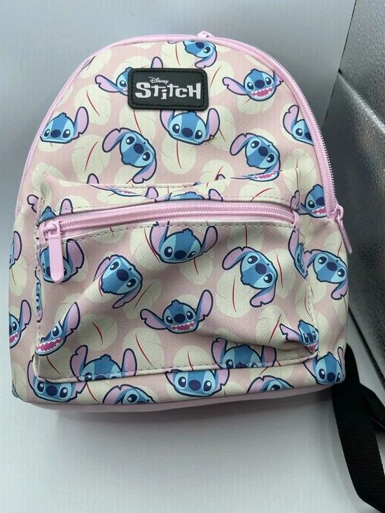 Disney Stitch mini backpack with repeating Stitch faces. Pink base with blue character accents. Front zip pocket and top zipper closure. Cute and playful design for everyday use.