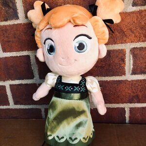Authentic Disney Store Frozen Anna toddler plush doll, approx. 14 inches tall. Features embroidered facial details, satin green dress with floral accents, and black hair ribbons. Made of soft polyester fibers, safe for kids, with high-quality stitching typical of Disney Store exclusive plush. Perfect for collectors or Frozen fans. Gently pre-owned, excellent condition, from a smoke-free home.