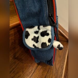 "Jessie from Toy Story" denim front back pack with leopard fur trim and plastic motif.