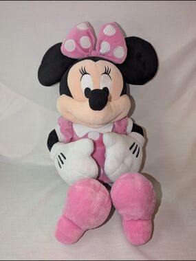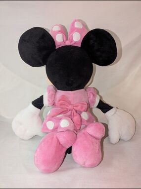 Disney Store Minnie Mouse. Soft and cuddly Minnie Mouse plush in pink outfit. Features signature bow and polka-dot dress for instant character recognition. Gentle, huggable fabric perfect for imaginative play and comfort. Bright pink accents add cheerful color to any toy collection. Pre-owned.