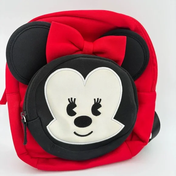 This listing is for a Dsney Store Minnie Mouse Mini Backpack Purse. This is a small red backpack featuring Minnie Mouse with her signature bow. This bag has a large zippered compartment and Minnie's face is a second smaller zipped section. It has adjustable straps on the back and a loop to hang it up. This bag measures approximately 10 inches long by 8 inches wide. This mini backpack purse is in beautiful preowned condition.