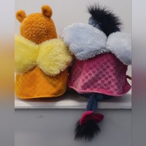 Adorable plush set featuring Winnie the Pooh and Eeyore. Pooh is in a red shirt with yellow wings. Eeyore is in purple with pink ears.