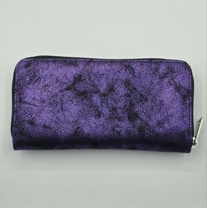 Faux cracked suede effect to the purple & black material. Features zip-around closure, multiple card slots, compartments for bills and coins. On the front, a circular patch displays Jack Skellington's face, characterized by his white skull-like appearance with black eyes and stitched mouth.