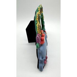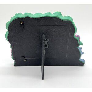 This Disney Eeyore picture frame is has adorable detail from the sunflowers to the little red birds. It measures about 9” long by 6.75” high. The plastic to cover the photo has yellowed and will need replaced or not used when adding a photo. There are no chips but the frame shows light wear. Please view photos for details.