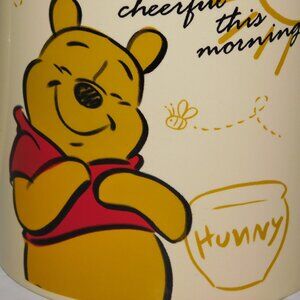 This Disney Winnie the Pooh " Particularly Cheerful This Morning " 14 oz Ceramic Mug is in Excellent clean bright condition. Mug measures 4" tall and 3.5" in diameter at the opening. Mug is microwave and dishwasher safe. Features same issue on both sides of mug. Has hand drawn Sun Hunny pot and bees with trails behind them.