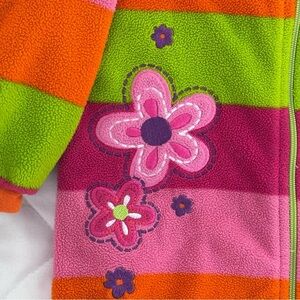 A bright striped piglet fleece onesie with beautiful flowers embroidered, extremely vibrant colors including pink, orange, green, purple. Perfect to stay warm at the arrival of spring <3