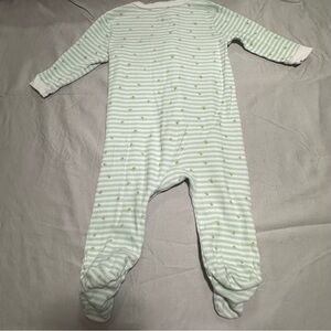 Adorable kids one piece with green and white stripes. Features a cute character design. Perfect for cozy days.