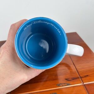 The mug features a vibrant design with classic Disney characters such as Mickey and Minnie Mouse riding a monorail, with the iconic Cinderella Castle and other park attractions in the background. The handle of the mug has the word "DAD" embossed on it. The inside of the mug is blue and features the Walt Disney World logo. It's a collectible item, and is popular among Disney enthusiast