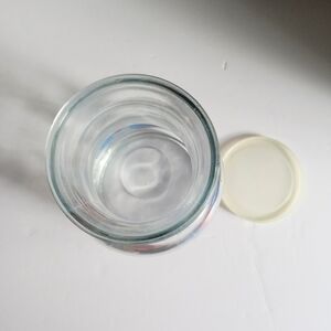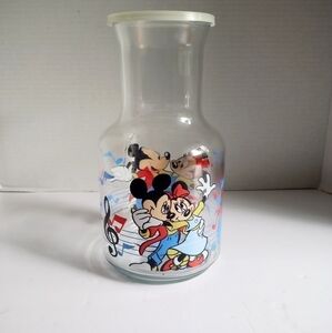 Disney vintage juice or water pitcher in glass with plastic cap with Mickey and Minnie Mouse. 3.5 inches diameter at the opening, 4,25 at the bottom, 9 inches high.