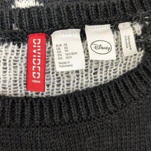 This sweater by Disney and Divided (H&M) is made of a blend of acrylic, wool, and mohair (79/12/9). It's black with white medium-sized polka dots and features a smiling Minnie Mouse on the front, wearing her signature bow. Although she's not on the back, the polka dots do continue everywhere. The sweater is warm and comfortable. There are no stains, pulls, or tears.