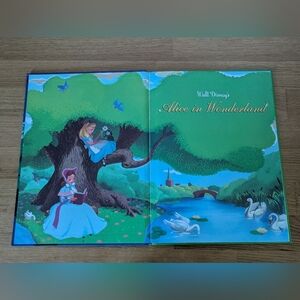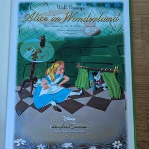Charming Disney storybook featuring Alice and the White Rabbit. Colorful cover with lush greenery.