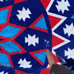 Beautiful bright pop of colours. Bought this towel because it matched our baseball team colours. New team, new colours so would hang on to this anyways but also happy to let it go to a new home. Previously used and has one snag (see picture #3 taken into account for price choice). It was caught on a chain link fence. I’m sure it could be an easy mend for someone that is talented with a needle and thread 🧵🪡.