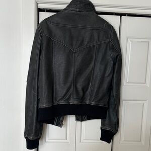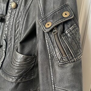 Greyish black leather with black trims , brass buttons , plaid lining with inside pockets
