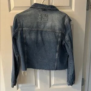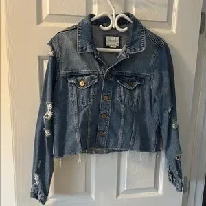 Stylish distressed denim jacket perfect for casual outings. Features a classic button-up front and a trendy cropped fit. Ideal for layering over your favorite outfits.