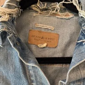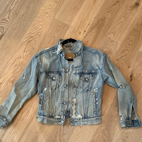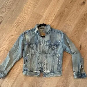 Stylish distressed denim jacket with a classic look. Features a light blue wash and rugged details.