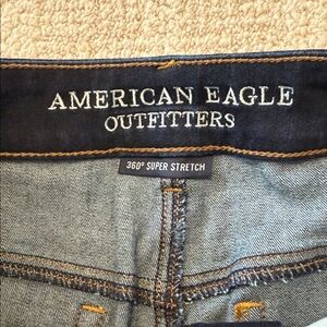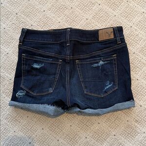 Stylish distressed denim mini short. Features frayed hem and ripped details. Perfect for casual outings. Size 8. Super stretchy. Barely worn