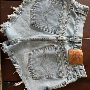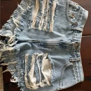 Stylish distressed denim shorts perfect for casual outings. Features a classic blue color with a trendy frayed design.
