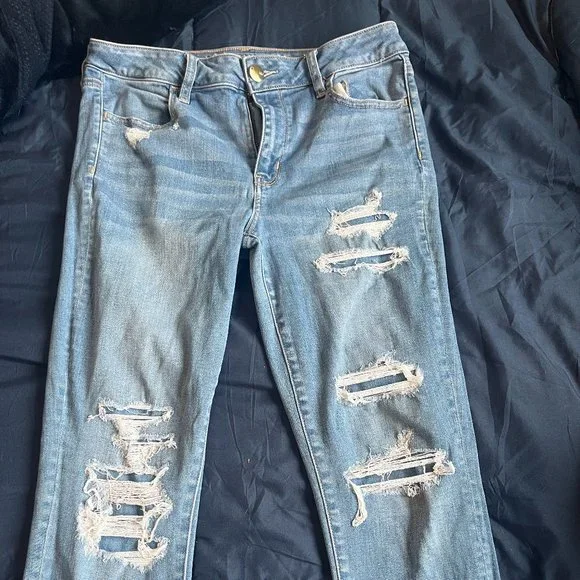 Distressed and mended jeggings (though fit more like mom jeans). Light blue with darker blue patches where distressed. Material is AE Super Stretch X.
