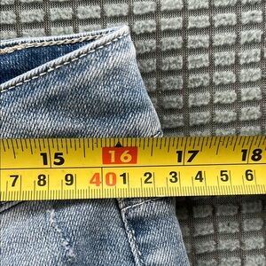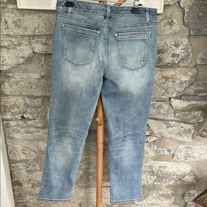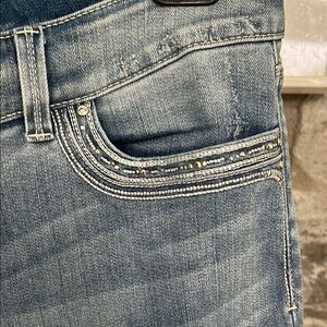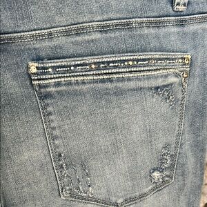Stylish light blue jeans with a distressed look and bling in front and back pockets. . Perfect for casual wear. Measurements in pics: waist, length and inseam. Says crop but these are regular length for 5’4”. Excellent condition