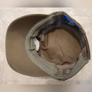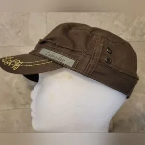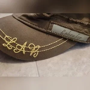 Stylish brown military style cap with a distressed look. Features patches and embroidery celebrating Labrador, and adjustable Velcro for sizing.
