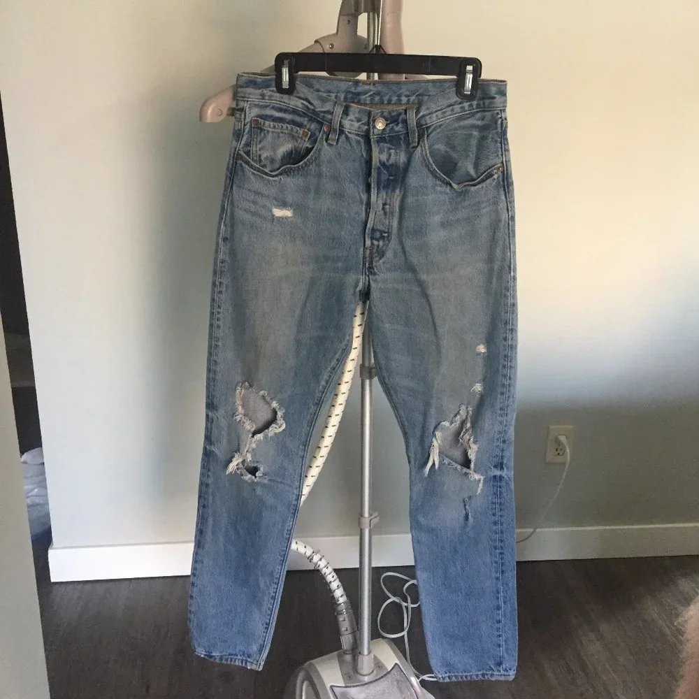 Distressed Levi's W 32 L 40 Rise 11.5. Medium blue, no stains, holes, or tears. Waist is a 32- posh does not go higher : )