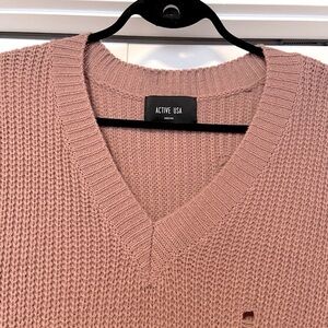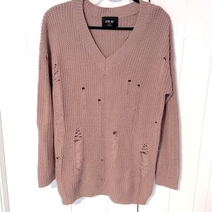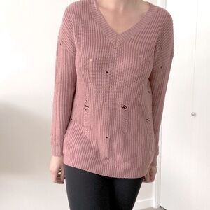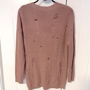 Super cozy and chic distressed mauve sweater with dropped sleeves. In new condition. Longer length and perfect with leggings and boots! 100% acrylic