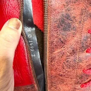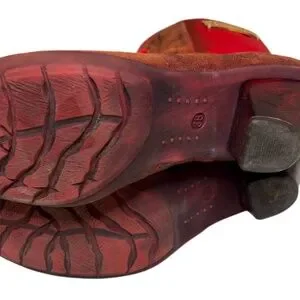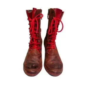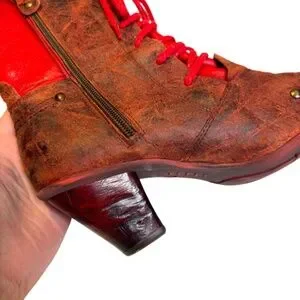 Unique distressed leather boots by Shuifa featuring a red leather exterior with striking red leather lining and matching red laces. These mid-calf boots have a lace-up front with a convenient side zipper, making them both stylish and easy to wear.