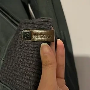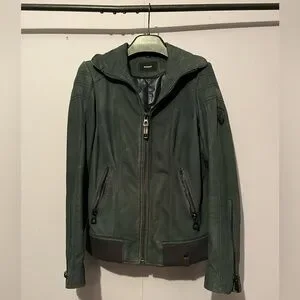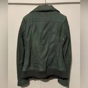 Cool looking teal coloured leather jacket by RUDSAK. Pix dont do it justice…the colour looks more lively in person! This jacket is pretty well-luved. Theres problems with most of the zippers. Front one doesn’t zip up smoothly, one of the zippers on the pockets wont zip up period. The zip pull on one of the sleeves is missing.