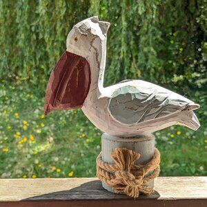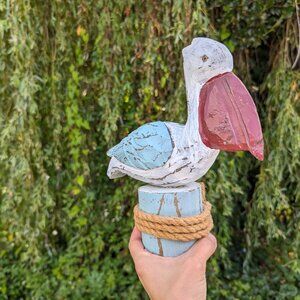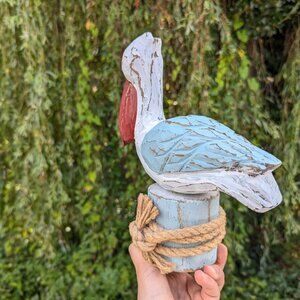 Distressed Wood Pelican sculpture, nautical Pine wood hand carved bird figurine