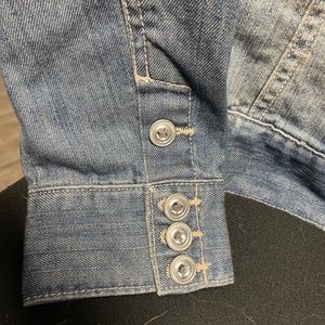Great slightly distressed jean jacket with mandarin collar with cute blingy buttons. Body is 24” long from top of the collar to bottom hem, measured at the back. Sleeves are 25” long. Slit pockets at sides.