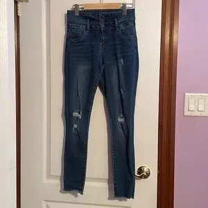 Ripped jeans with frayed bottom. High rise push up style with 3 buttons.