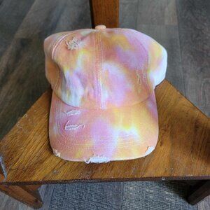 Distressed pink, white and orange tie dyed baseball hat with ponytail hole