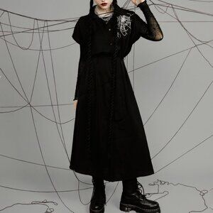 Disturbia Widow Relaxed Midi Shirt Dress. Loose fit collared button up midi shirt dress. Buttons from collar to hem with front split. Silky non-stretch Polyester fabric. White spider and web embroidery on shoulder. Comes with belt. A size US 2 on the tag but the sizing is falls larger for this one. Can fit S to XL depending on how loose or tight a fit you want. Plenty of room. In brand new condition, never worn. Really cool piece perfect for the spooky season!
