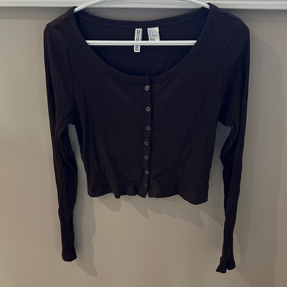 Chic ribbed design with button-down front. Long sleeves for versatile styling.