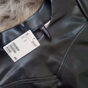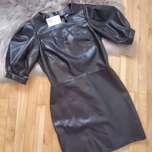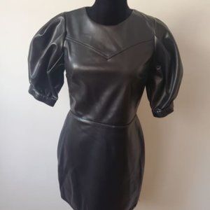Faux leather mini dress, short puffed sleeves, zipper on the back, close fit, round neckline, unlined.