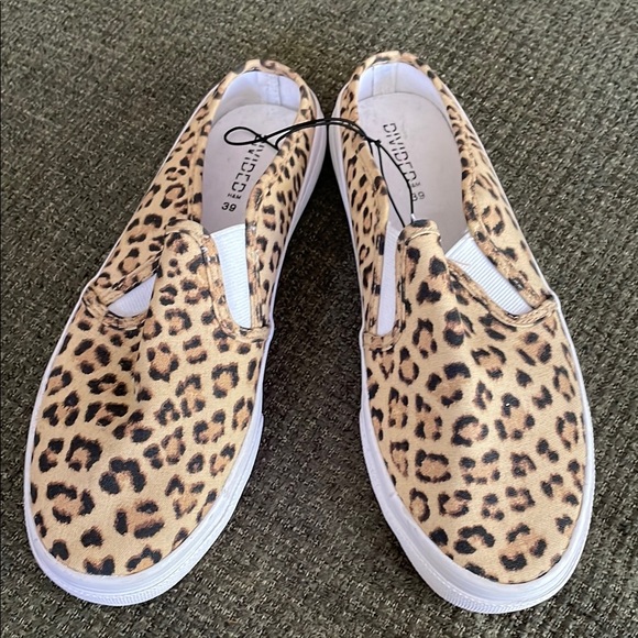 Never worn canvas leopard print slip-on sneakers in good condition. Elastic on top. White rubber rims.