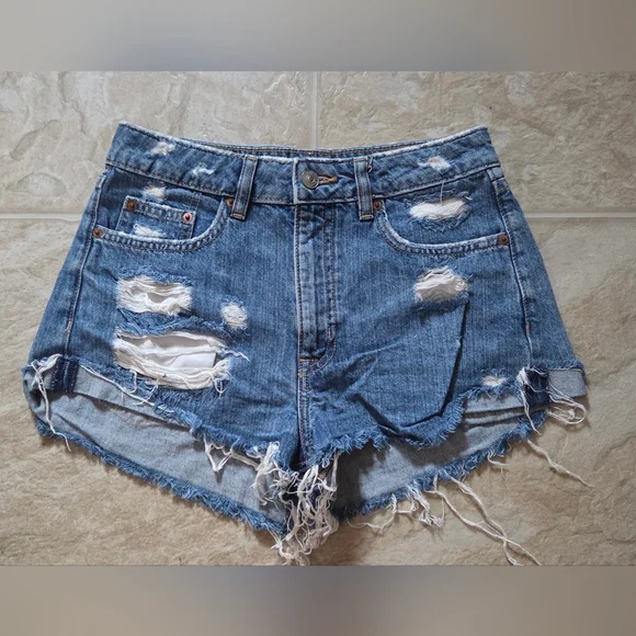 Trendy light blue jean shorts with ripped details. Ideal for a casual look.