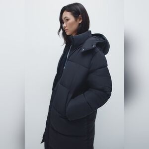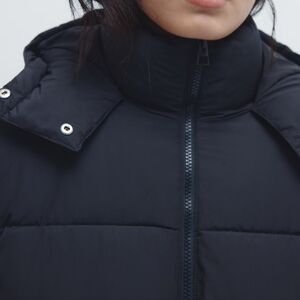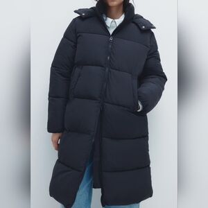 Long, padded jacket with a hood and stand-up collar. Zipper at front, welt front pockets, and long sleeves with concealed elastic at cuffs. Lined.