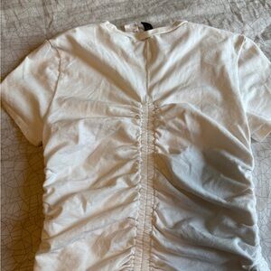 Soft, stretchy fabric with gathered center detail that creates a slimming, contouring fit. Perfect basic that pairs easily with jeans, leggings, or skirts. Great for layering or wearing on its own.