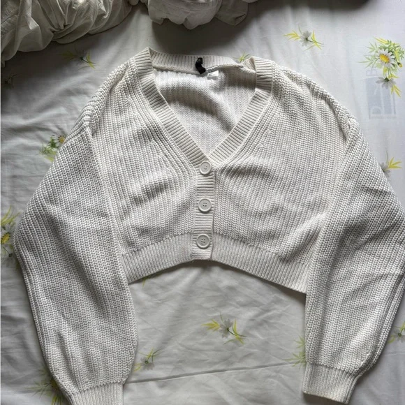 Chic white cardigan with button-up front. Soft knit fabric. Perfect for layering.