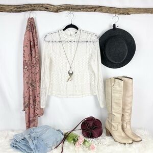 Divided White Lace Long Sleeve Crew Neck Top Size Medium